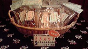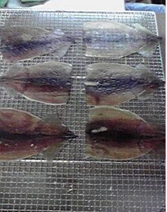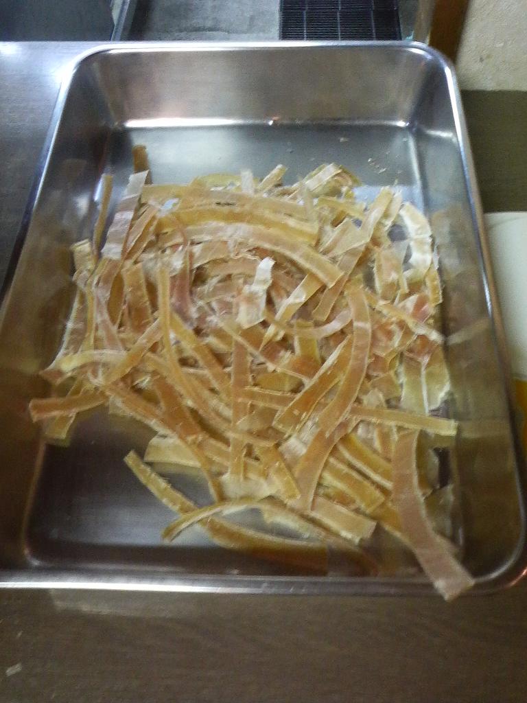 日本海倶楽部レストランショップ 好評につき完売していたさきスルメが、ついに店頭に戻ってきました スルメいかを海洋深層水で浸し、3日間スルメを干して皮を剥いて、スルメを切り分けた状態だよ ↓