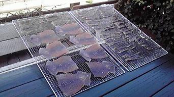 今日はさきスルメをネットの上に置いて、日当たりの良い場所に置きました。3、4日干せばさきスルメ完成です