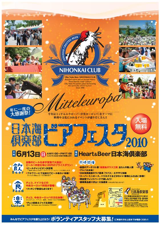皆様お待たせしました! ビアフェスタ2010 6月13日(日)11:00~17:00開催致します!!! (ポスターはHeart&Beer日本海倶楽部のHPで拡大されたものが見れます) 今年のテーマは、 Mitteleuropa(ミッテルエウローパ、中央ヨーロッパの意) ピルスナーが生まれたチェコの文化を中心とした中央ヨーロッパがテーマです! スタッフ一同がんばっておりますので皆様どうぞお楽しみに~! TH