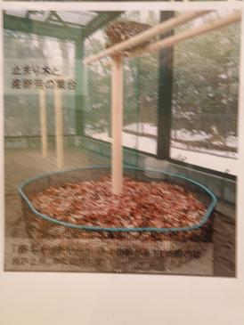 ←繁殖ケージ内にある、真ん中の木がとまり木。その上にちょこんと置いてあるのが朱鷺産卵用の巣箱。下の落ち葉が沢山あるのが卵を産んで下に落ちた時の保護用で卵キャッチャーです。